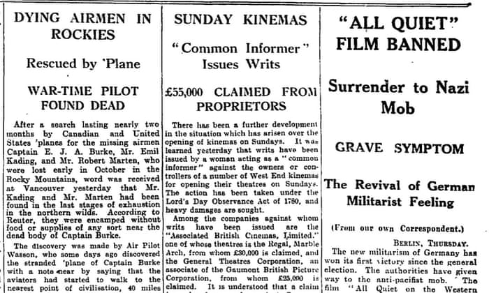 Dewan Sensor Film Jerman telah memutuskan untuk melarang All Quiet on the Western Front karena hal itu "merusak prestise Jerman". Tentu, jika prestise Jerman terikat dengan kebohongan lama kemegahan perang, maka All Quiet adalah serangan yang sangat merusak. Namun untungnya, reputasi Jerman di dunia saat ini sebagian besar dibangun di atas keberanian dan kejelasan yang dengannya penulis dan dramawannya mengungkap dongeng "patriotik" lama. Banyak orang Inggris yang dihadapkan pada pengagungan perang yang sentimental dan nakal yang masih terlalu umum dalam film, sangat berterima kasih kepada Herr Remarque atas deskripsi yang jujur dan untuk versi film dari novelnya. Kebanyakan orang Jerman berbagi rasa terima kasih ini; mereka menyadari bahwa bukan Jerman tetapi militerisme - penyakit internasional - yang dikecam dalam All Quiet.